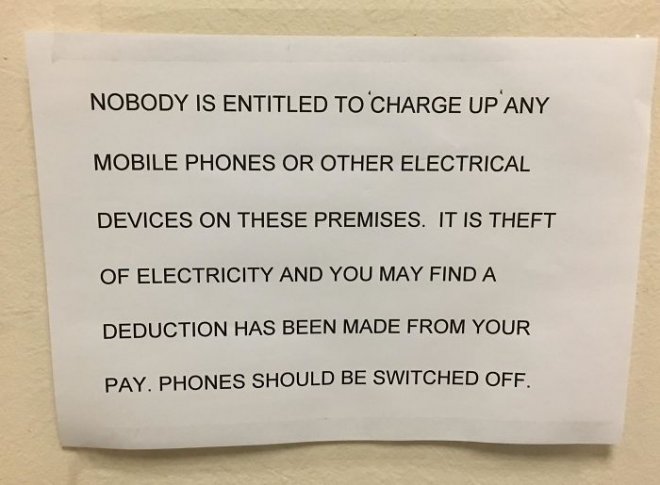「誰都不准在店裡充手機,或是任何電子產品,這是小偷的行為,有可能會從你的薪水裡扣電費。上班時手機要關機。」
