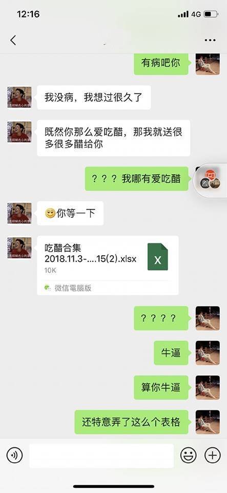 臉書粉絲專頁《 Pink Boom 》近日 PO 出好幾張相片表示「男子怒送十箱醋给女友被分手,啥操作」,甚至還製作一張「女友吃醋紀錄表」,從相片中的對話紀錄中可以看到,女方非常不理解為何在生日當天會收到十箱醋,甚至不敢相信的問男友「真的都是醋?」,直到看到男友肯定又讓心碎的答案後大喊「我搬十箱這麼重的東西上樓你就跟我說十箱醋?我真他 X 服了」,而男方更接著說「既然你那麼愛吃醋,那我就送很多很多醋給你」,隨後更附上一份「女友吃醋合集的表格」,讓女友氣瘋大喊「牛逼,算你牛逼,還特意弄了這表格」。