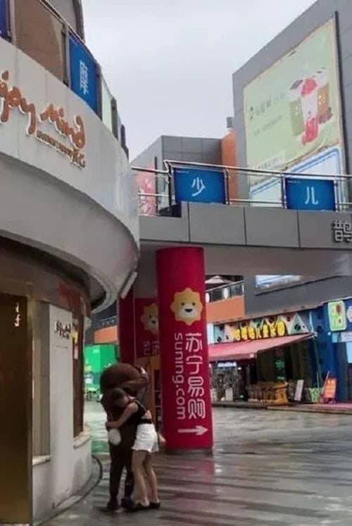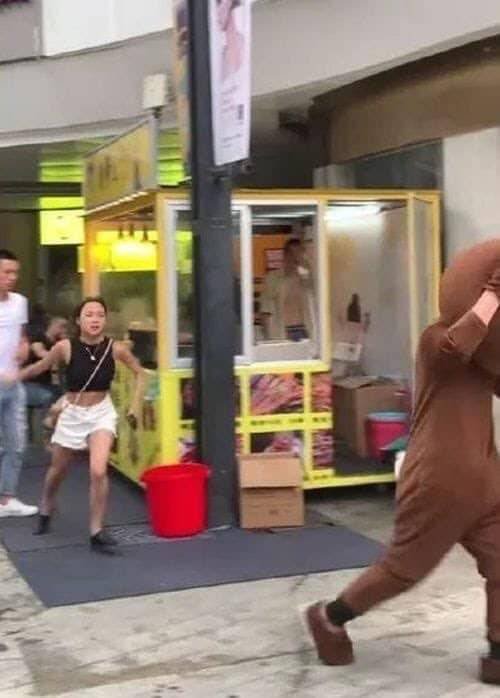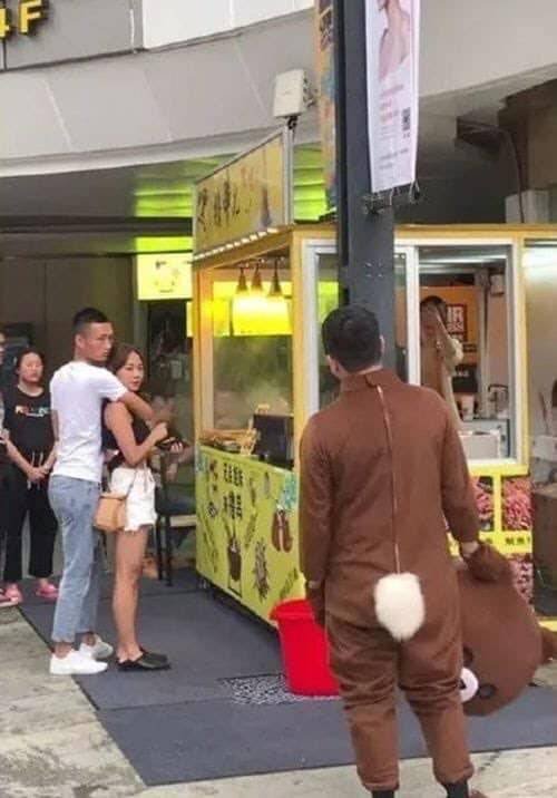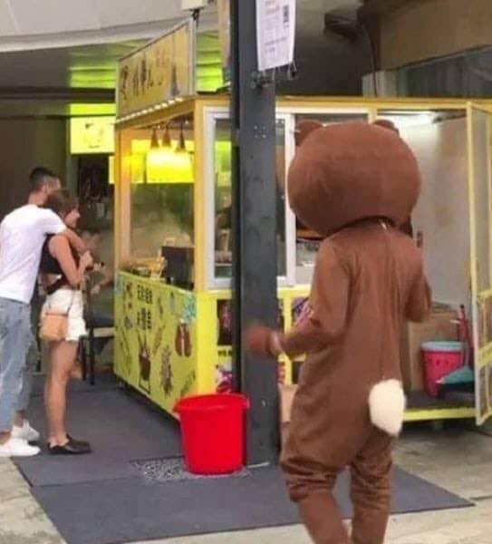 穿著熊玩偶裝打工的男子,竟看見自己的女友在跟其他男生拍拖。
