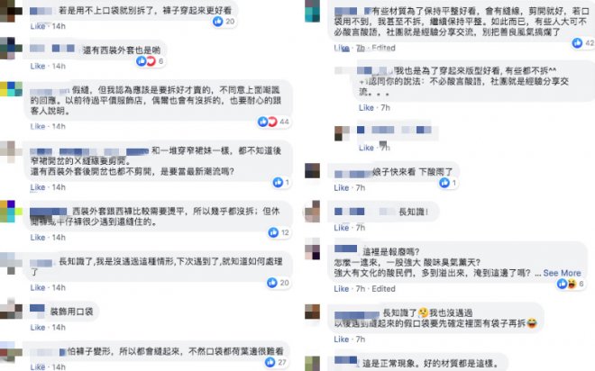後來照片曝光後,就立刻釣出達人回覆,表示這樣口袋被縫住,並不是廠商失誤所造成。他進一步解釋,這個設計的專業術語叫「假縫」,比較常見於西裝,目的是為了方便店員熨燙,同時也能讓版型看起來更挺、不易變形。不過也有人說,「一般平價服飾店會先拆好才買,很少遇到休閒褲或牛仔褲還是縫住的」、「以前待過平價服飾店,偶爾也會遇到沒拆的衣服,要耐心地跟客人說明。」