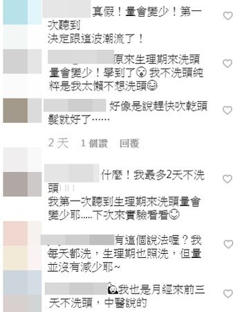 「沒聽到生理期來洗頭量會變少耶…下次來實驗看看」、「真的有差嗎?」、「有這個說法喔?我每天都洗,生理期也照洗,但量並沒有減少耶~」、「好像是說趕快吹乾頭髮就好了⋯⋯」、「是中醫說的嗎?我只知道月子不要洗頭」