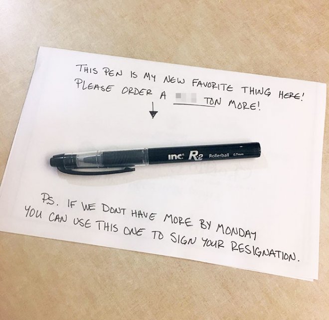 「這隻筆是我的新歡,請幫我多訂一些。PS.如果禮拜一之前沒訂到,你就用這隻筆填你的離職單。」