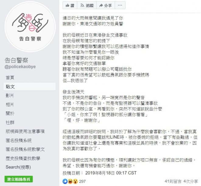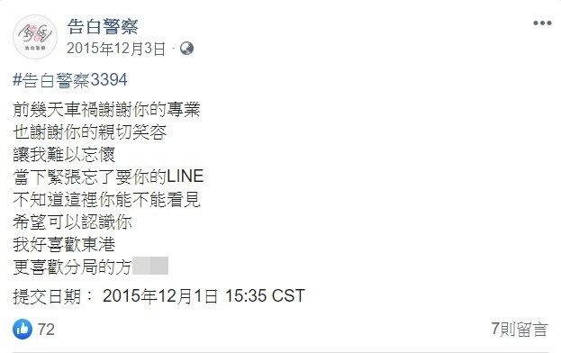 日前有名網友在臉書粉絲專頁《告白警察》中發文說,日前媽媽因為交通狀況,找來警察處理,其中一名方姓員警,到了現場之後,馬上就擄獲了這名女網友的心,讓她一直盤算著:「要如何才能認識你?」加上過程中,對方一直很體貼、細心,讓她終於鼓起勇氣,決定開口要電話、要Line,沒想到被一口回絕,所以就PO文表示,自己絕對不會放棄的,如今網友終於找到這名任職於東港的警察了!