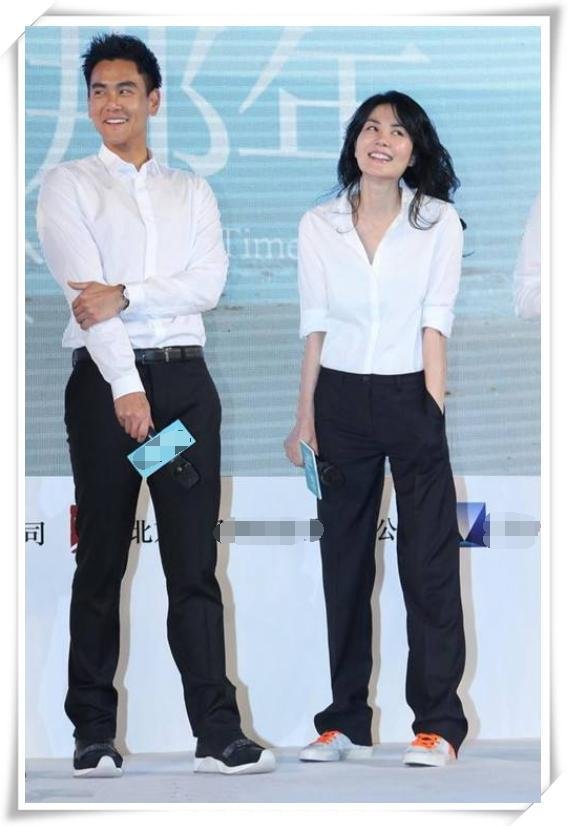 中性的裝扮也是王菲也能夠駕馭,白色的襯衫袖子被王菲卷到了胳膊肘的部位,凸顯了王菲四肢的纖細,而黑色的西裝褲,因為是高腰的設計,所以讓身材矮小的王菲,也有不錯的腿部比例。