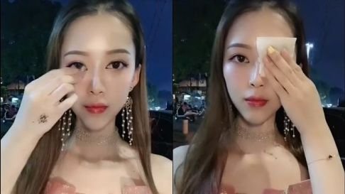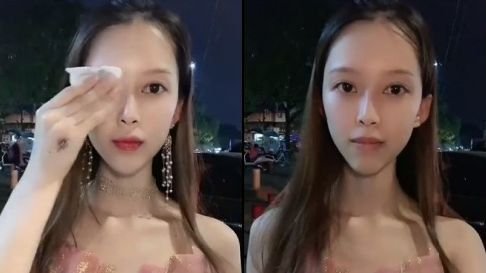接著她在鏡頭前開始卸妝,首先摘下瞳孔放大片,接著撕下假睫毛,以及用來修容、俗稱「瘦臉貼」的醫美膠帶,再來用化妝棉沾點卸妝油,卸掉眉毛和眼妝,然後徹底卸掉臉上的粉底液,最後卸掉口紅,拿掉耳環後再換上居家服,雖然卸妝後氣色差了一些,卻多了一股鄰家女孩的感覺,看起來相當清純。