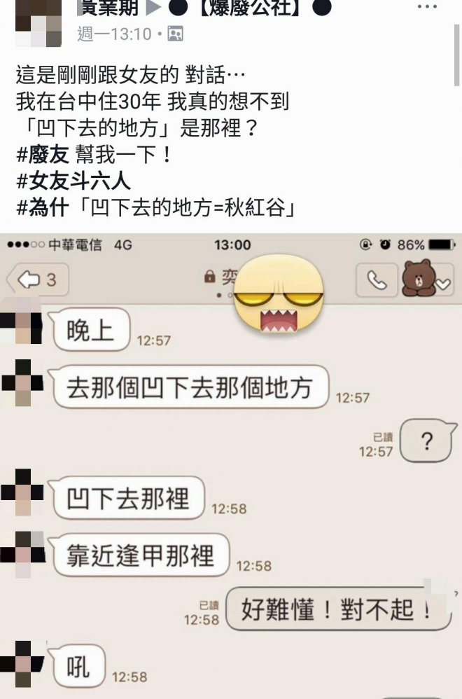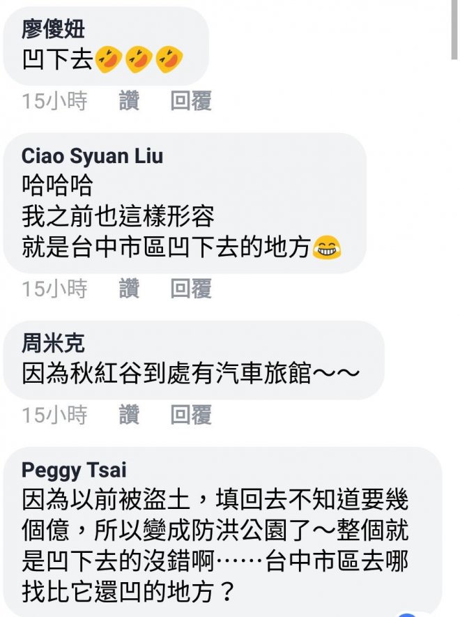 我在台中住30年, 我真的想不到「凹下去的地方」是那裡?#廢友 幫我一下!#女友斗六人【最後答案出爐原來是秋紅谷】#但為什「凹下去的地方=秋紅谷」【社員留言】「 台中人!如果你問我,凹下去的地方,我一樣不知道」「意思是說去那個凹咖的地方⋯⋯ 」「還好他不是跟你說去那個洞…. 」「 秒想到秋紅谷 」「 凸起來的地方在 」「逢甲那附近凹下去的地方好像也只有秋紅谷 」「 我有時候也會用奇怪的形容詞形容一個地方 」「靠近逢甲附近可以凹腳的地方…專業翻譯員 」