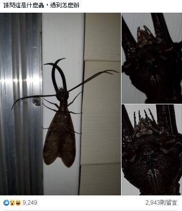 根據《三立新聞》報導,女網友在凌晨時貼出照片寫「請問這是什麼蟲,遇到怎麼辦?」,照片中可以看到蟲子外型相當詭異,有著像牛角般的雙鉗與2條長觸鬚,更驚人的是牠看看起來相當巨大,彷彿就像是遠古時代的昆蟲一樣,不少網友看了也直呼「比蟑螂還可怕!」、「好可怕,怎麼會這麼大隻啦!」、「 這什麼,異形嗎」「地球有這種生物嗎?」。