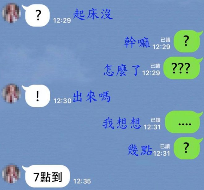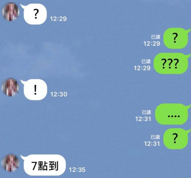 答案揭曉!在大家一陣問號號,終於有神人網友翻譯出兩個閨蜜標點符號的意思了!原來第一個女生的問號是在問對方「起床了沒」,另一個人回應的問號則是「幹嘛」、「怎麼了」,接著驚嘆號則表示「出來嗎」,後來點點點代表讓她思考一下,最後問號表示「好啊,要約幾點?」所以最後才會出現「7點到」的結論,