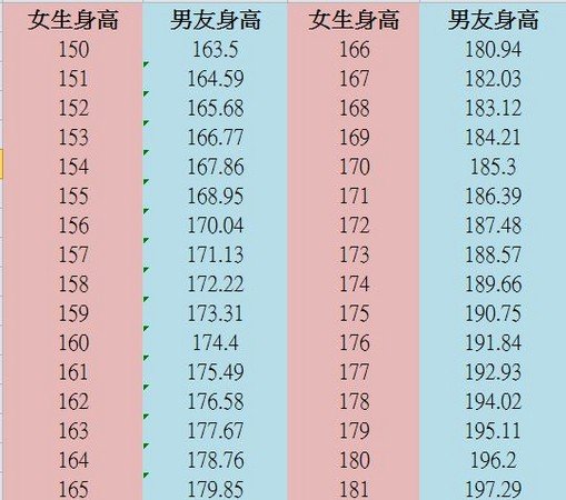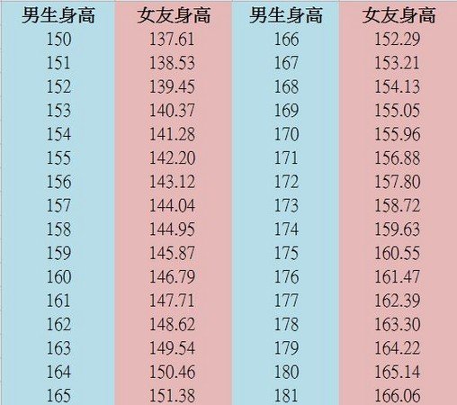 這幾天,中國論壇開始流行一種情侶黃金身高差公式,就是(女生身高)x 1.09 = 男生身高(男生身高)÷ 1.09 = 女生身高