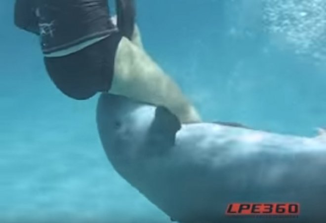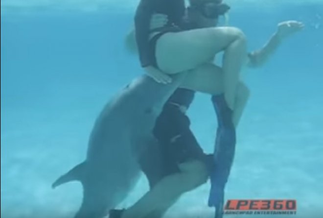 而她的男友在發現不對勁後,就把女友抱在懷中想要解救,沒想到海豚還是不放過的一直跟著女泳客的屁股......最後竟然還伸出他的GG......