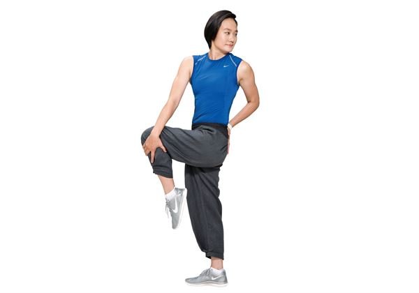 抬膝轉體:吸氣,右腳抬膝,吐氣,左手放到右膝外側,右手置於右邊腰際,臉向後看。(圖片/瑞麗美人國際媒體提供)