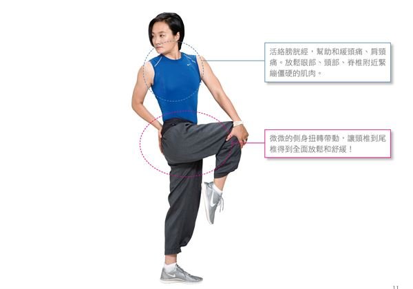 至於,想要有效疏通膀胱經具體而言該怎麼做?李筱娟教練特別分享以下2招,加上獨立步和扭轉的改良版「回眸一笑」動作,提供給民眾參考,藉此輔助人體從頸椎到尾椎、從頭到腳得到全面的放鬆和舒緩: