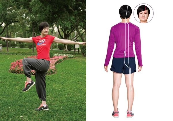 一開始可能會重心不穩而搖晃,所以可以先將獨立步站穩了,再慢慢轉頭,不要一開始就因為心急而同時做兩個動作。這個動作可以訓練到單腿肌力、肩膀後背的背闊肌、頸部斜方肌與腰部肌肉扭轉。