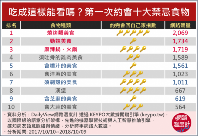 因此,為避免「當朋友就好」的想法老是一秒摧毀你的愛情,現在就讓DailyView網路溫度計運用《KEYPO大數據關鍵引擎》進行大調查,看看江湖老司機熱議的約會禁忌美食有哪些,以幫助你擺脫天煞孤星的人生,從此走出單身狗行列!