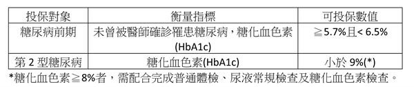 註1:「糖尿病前期」指未曾被醫師確診罹患糖尿病且其糖化血色素(HbA1c)值大於等於5.7%而小於6.5%者,「第2型糖尿病」指依照世界衛生組織糖尿病分類標準歸類為第2型糖尿病者。「智糖人生」投保參考標準如下:
