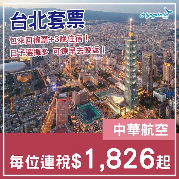【台北】超多日子揀!早去晚返都得!台北4日3夜套票,包來回機票+3晚住宿,每位連稅$1,826起!4月尾至12月尾出發