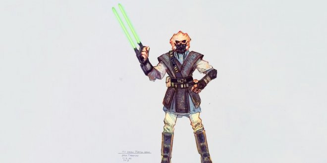 There is a piece of concept art depicting Plo Koon with something like a lightsaber gauntlet. The weapon is held by a bar across the hand, like a normal lightsaber, but attached at the wrist as well, with twin short blades protruding forward, rather than up. It's almost as if this is a lightsaber designed specifically for offense, rather than the defensive weapon it's supposed to be. These are Wolverine-like claws, not something that could easily be used to deflect blaster fire or subdue an enemy. These claws seem to be made for war, which fits perfectly within the Jedi Order's decline into the prequel era.