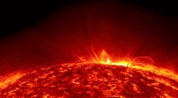 同樣的道理,當太陽表面局部磁場的磁力線因為「磁扭纏」達到臨界值而斷裂之后,也會釋放出大量的能量,與此同時,該磁場的磁力線也從原來的閉合狀態變成了開放狀態,在巨大能量的驅動下,大量的等離子體物質會洶涌而出,而由于等離子體物質會受到磁場的約束,因此它們就會順著開放的磁力線運動,進而在太陽表面形成跳動的「火舌」。