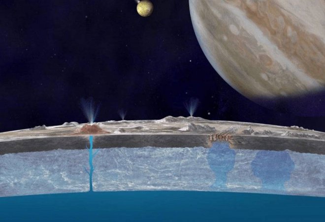 但當探測器路過這顆星球之后,人們才發現,這顆星球或許有遠超人類想象的潛力。前文也說過,木衛二的表面是一層厚厚的冰層。而 在這層冰層之下,則是一片浩瀚的海洋。生命,很可能就在這片海洋之下。