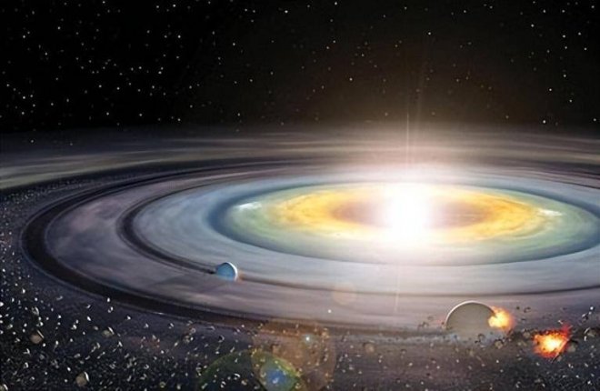 在原始太陽形成之后,其太陽外圍的剩余物質則繼續圍繞著他旋轉,一部分氣體慢慢聚集形成了氣態行星,而上一代恒星遺留下來的重元素則形成了巖石行星。