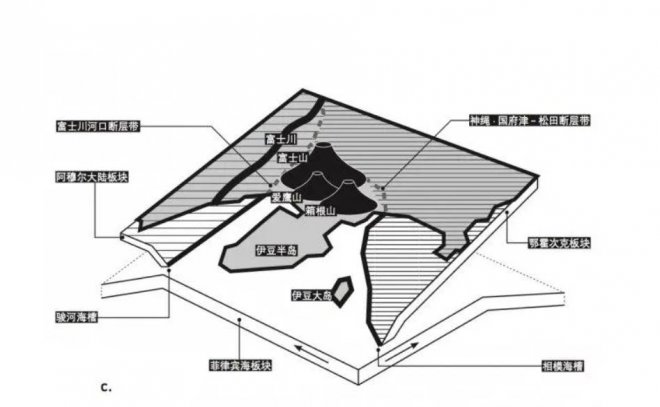 日本富士山位于板塊運動的「三聯點」,分別為阿穆爾板塊、鄂霍次克板塊和菲律賓海板塊,同時它還位于日本東北島弧、西南島弧和伊豆—小笠原弧交界處,完全是一個「俯沖帶」高度活躍的區域。