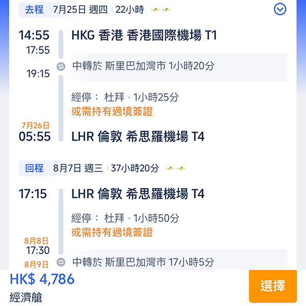 去程:香港/斯里巴加灣(汶萊)BI636 14:55/17:55;斯里巴加灣(汶萊)/倫敦希斯路 BI097 19:15/05:55(+1)(中間經停杜拜1小時25分,不用轉機)
