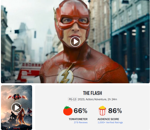 而且《閃電俠》的爛番茄和MTC評分也都下降了。目前爛番茄新鮮度66%,爆米花指數86%。