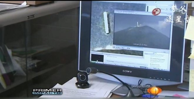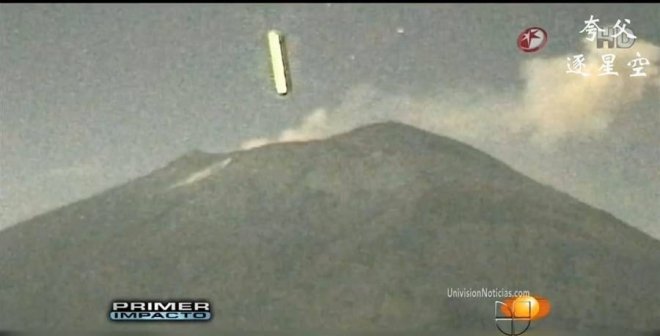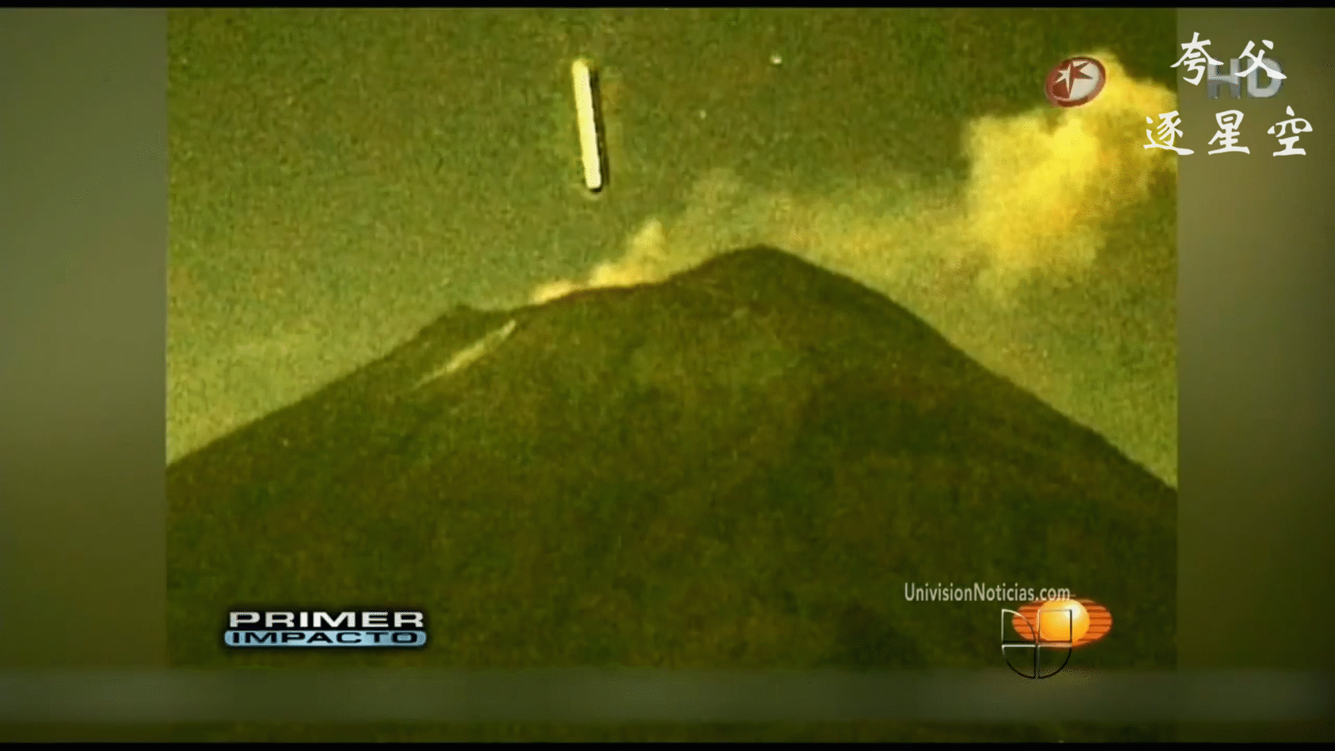 再來看這一條視訊,它是墨西哥電視台報道的,2012年10月25日晚上,墨西哥國家防災中心位于波波卡特佩特火山的一個監控攝像頭,拍攝到了一個無法解釋的畫面,一個巨大的雪茄型不明物體一頭栽進到了火山口內!參照這個火山口的直徑800米來算,這個巨型的雪茄型UFO竟然有兩三百米那麼長。而且波波卡特佩特火山近些年曾多次拍攝到有不明飛行物活動,所以很多UFO研究者傾向于該火山口內藏有秘密基地。