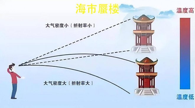 另一方面,如果下層的空氣溫度較低,上層的空氣溫度較高,那麼,光線在這樣的空氣層傳播時,就會不斷被向下偏折。這種逆溫層有時會出現在海面上,從而造成壯觀的海市蜃樓景象。