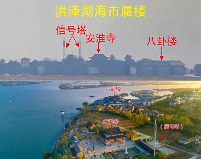 除了海面上的懸浮巨輪,如果海市蜃樓發生在陸地上,有時也能在蜃景中看到建筑物,例如,這是此前發生在洪澤湖附近的海市蜃樓: