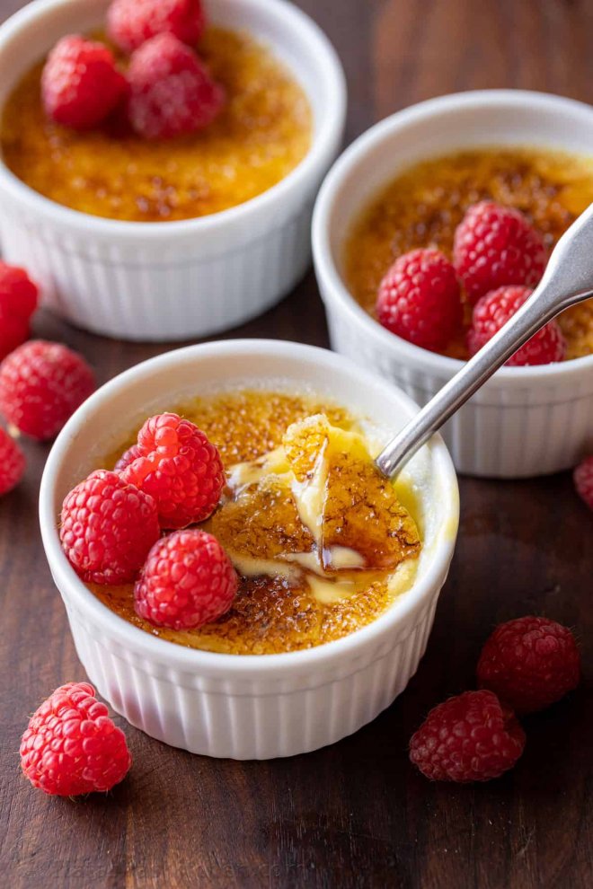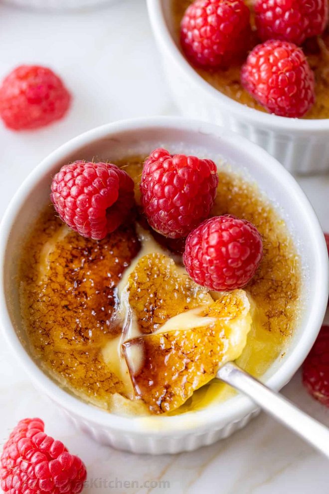 Raspberries – or use mixed fresh berries to pile onto your creme brulee and top with a mint leaf to add flavor and color.