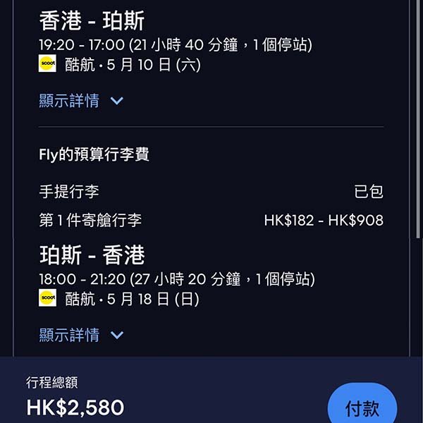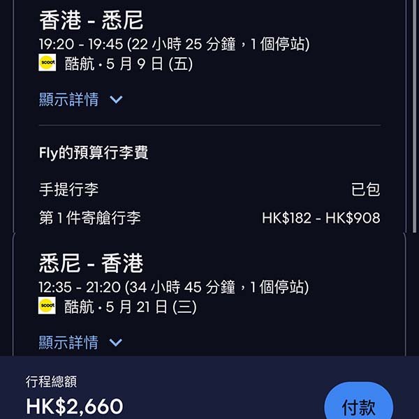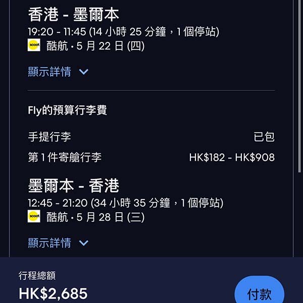 結論:事隔3個月,酷航又翻炒,價錢比上次貴幾十而已。話就話去到9月頭都有,不過Check過系統,12-1月黃金暑假無平,10及1月、明年1至5月都唔太難見到靚價,打後日子去返三千,唔算平啦(除非您買單程,咁一定Scoot最平)~搭酷航最大好處係手提行李多達10kg及可帶2件,對背包客/回鄉客夠用有餘,就算加埋寄艙行李只係三千中,當然代價係新加坡中停時間超長,有時要隔成日,您可以諗成幫你「一雞兩味」玩埋新加坡囉~