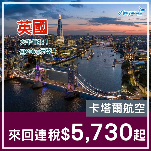 【英國】嘩!平靚正!卡塔爾航空來回連稅倫敦$5,730起、曼徹斯特$6,351起、伯明翰$6,439起,包20kg行李,11月30日前出發!