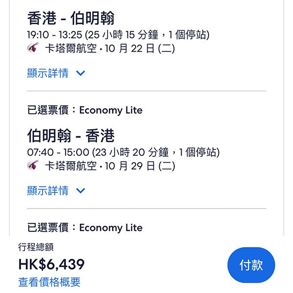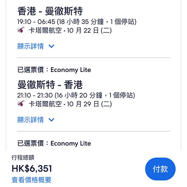 來回連稅價:HK$5,730起(倫敦格域)、HK$6,183起(倫敦希斯路)、HK$6,351起(曼徹斯特)、HK$6,439起(伯明翰)