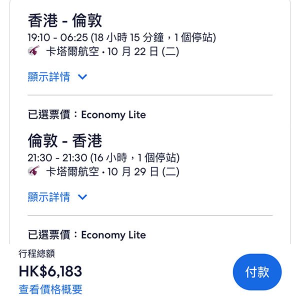 結論:正!六千有找就坐到出曬名質素好嘅卡塔爾航空,轉機仲可以順路玩埋多哈。Check過系統,供應量算充足,快啲買去英國搵屋企人/frd啦!