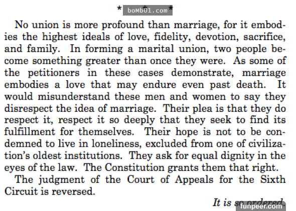 ▼隨著美國最高法院對於同性婚姻的解禁,更多有著這樣困擾的同性情侶們也可以得到保障。美國最高法院法官安東尼(Anthony Kennedy)在同性婚姻上也寫下了一段美麗的判詞。