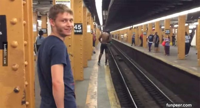 這段影片發生在紐約的地鐵站中,一名黑人男子站在軌道的另一端與朋友對話,另一邊的朋友似乎在鼓勵著他直接跳過軌道到另一端來。