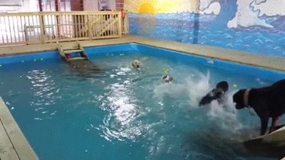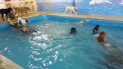 不愧是愛玩水的狗狗,看到游泳池的反應大概跟小孩差不多,有些興沖沖地往下跳,也有些在旁邊觀望,但感覺每隻都是亢奮到不行啊!最後一定會捨不得離開吧!動動手指,把這個可愛的景象一起分享給大家看吧!