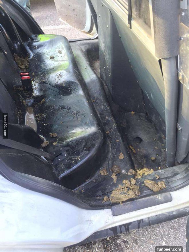 黛西在警車上並不安分,受驚的牠肆無忌憚地大小便,搞得整輛巡邏車臭氣熏天、狼狽不堪,警方也把黛西的傑作放到了臉書上。雖然最後黛西回到了養豬場和主人團聚,但這張照片卻成為了當地警方的一個永遠的笑話。快把黛西的傑作分享給朋友,讓大家知道警察有多難當吧。