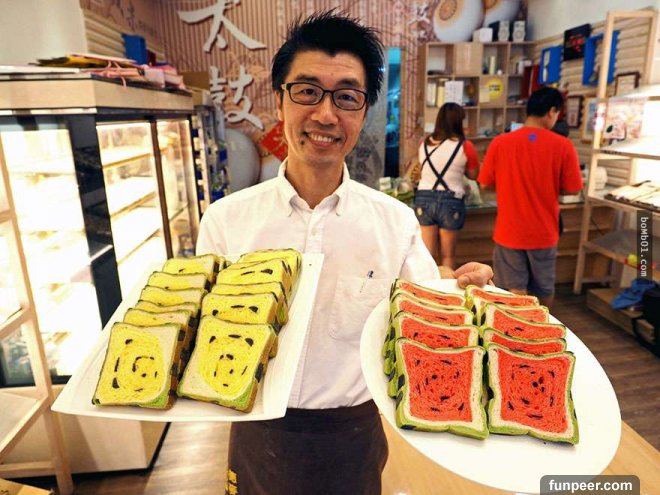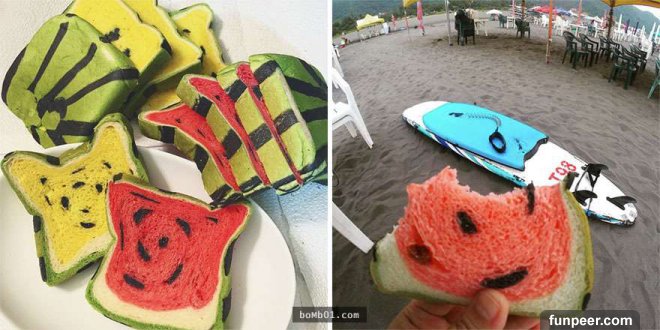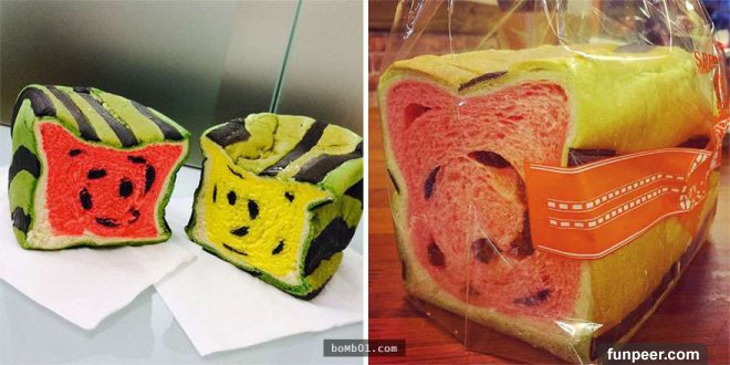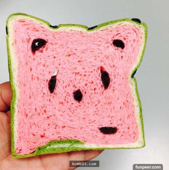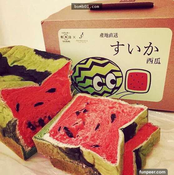 ▼西瓜吐司麵包的發明原因據說是老闆的小孩夏天不喜歡吃麵包,於是他特別製做了這個看起來很涼爽可口的西瓜吐司麵包!