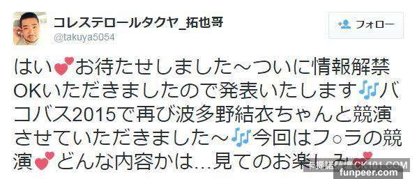 「嗨~讓各位久等了!終於等到了情報解禁的這一天~所以我來告訴大家啦!bakobus2015,我會再度與波多野結衣一起共同出演~這次的“吹X”演出會以怎樣的形式展現呢?還請各位拭目以待♥」