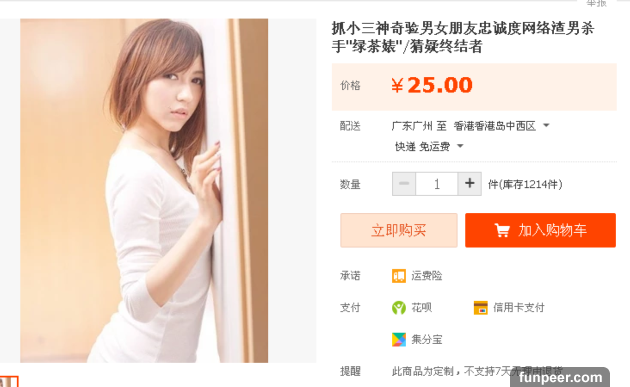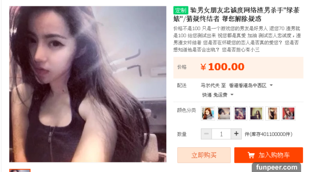 「拍下寶貝後,店員會以陌生女孩的形式加你男朋友的qq或微信來吸引你的男朋友,根據你提供的自己男朋友的信息,比如他的年齡、經歷、愛好來定制話題。聊天結束後,店員會把聊天記錄發給你,讓你看到男朋友的一舉一動。」最近,內地淘寶網流行的這款名為「考驗男朋友忠誠度、渣男殺手、猜疑終結者」的產品服務,十分火熱。