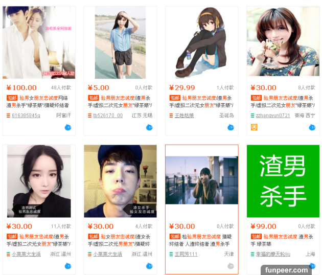 有內地淘寶商家提供另類「愛情放蛇」服務,讓女顧客僱用網絡「美女」勾搭自己的男朋友,以測試其忠誠度。結果令女士們感到絕望:九成被放蛇的男士直踩愛情陷阱,向「美女」表白。商家將他們的產品稱為「渣男殺手」。
