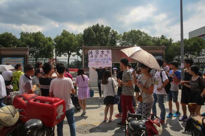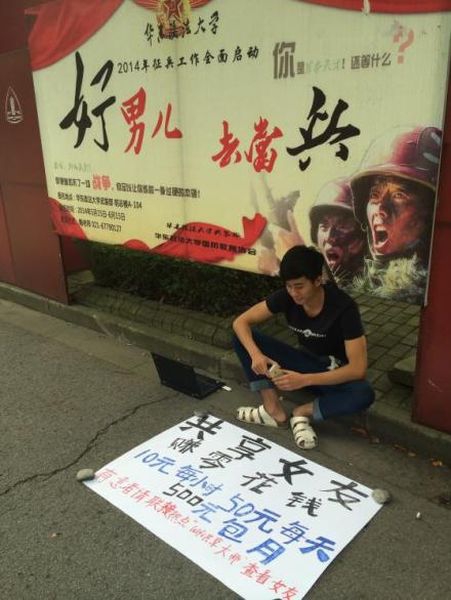 這位被指就讀中國上海松江大學的男學生在校園附近舉起紙牌,以「共享女友賺零花錢」做招徠,並列出女友條件,吸引不少途人駐足圍觀甚至上前詢問。
