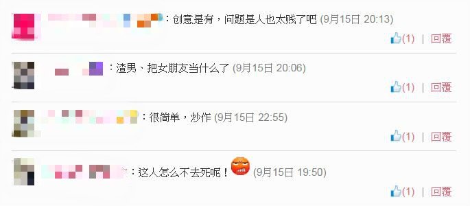 消息一出隨即在網上瘋傳,網民紛紛鬧爆他所做的是賤男行為,沒有尊重女友;亦有人認為他是想炒作引人注意,登上微博熱門榜。