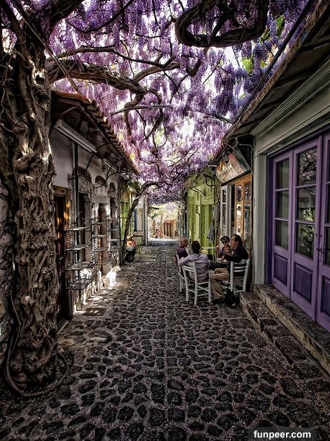 Lesvos島位於北愛琴海,是希臘第三大島,也是地中海第八大島,而島上有座古山城Mithymna,是Lesvos島第二大旅遊重鎮。Mithymna,古稱Molivos,地處小島北部,當之無愧是島上最美的小城。山坡上的石砌建築保存良好,蜿蜒曲折的街道上隨處可見橄欖樹和松樹,偶然也能見到像圖片中這樣美麗的紫藤花棚。小鎮上保留一些中世紀以來的古城遺址,小鎮高處還坐落了拜占庭式的城堡,遺留中世紀風韻.島上儘管以時期建築為主,但色彩十分豐富,對於旅遊攝影愛好者來說,絕對是個散步的好去處。