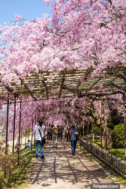櫻花種類之多,除了能感受櫻吹雪的櫻花道外,枝垂櫻似乎又能帶來別樣的感受,而在京都要賞枝垂櫻,除了平安神宮之外,鴨川賀茂川堤段半木之道也是個熱門名所。花季時河岸花架上攀滿一片櫻色,顯得特別夢幻,側眼去還能望見鴨川美景,可說是春日京都不可錯過的景色之一。