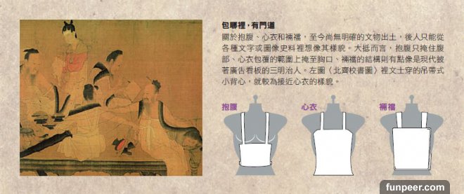 馬王堆的素紗襌衣也是一件有名的「內衣」,素色的薄紗輕如蟬翼、透若煙霧,穿著這樣的內衣⋯⋯想想也真是蠻性感的,樸素果然是王道!(?)當時還有 其他種的內衣,東漢末劉熙《釋名》中記載當時有幾種衣物,大抵都屬內衣之流:「帕腹,橫帕其腹也。抱腹,上下有帶,抱裹其腹,上無襠者也。心衣,抱腹而施 鉤肩,鉤肩之間施一襠,以奄心也。」最簡單的只是拿塊帕子包住肚子,複雜點就加綁帶、加長加寬好蓋住胸口。其造型可能跟後世的肚兜有點像,主要是為了腹部 的保暖,掩胸是附帶的,背後更是全空。從《北齊校書圖》文士所穿的小吊帶內衣,可以想見這類內衣穿起來的樣子。