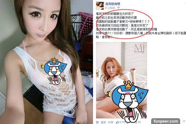 我的個性就是說到做到,說到做到──尤其是答應鄉民的事情更要做到!」還說「因為提早做到了,所以做人要有誠信」,然後她確確實實地獻上兩張半身全裸吃雞排的性感火辣照,讓網友大讚她信守承諾、敢做敢當,還有網友說「妳雞排可以切,我們不介意啊」,甚至有網友故意說「想吃雞排,喝雪碧」。