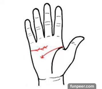 一般地說(如圖),在智慧線末端有叉狀紋,表示這個人疑心較重,而感情線短促,且上下均有歧線支出,表示這個人在感情上最容易全部投入,同時也喜歡對方全部投入,而且把對方給予的愛當成是自己的「私有財產」,所以這種人的感情雖有可愛的一面,但更有可怕的一面,如果調整不當,就會容易引起無端風波。男女結合的媒介是愛情,愛情萌發需要土壤,這種土壤是彼此關心、體貼、呵護,而不是互相猜疑,所以有此手相的人切記:愛情不妨大撒把。